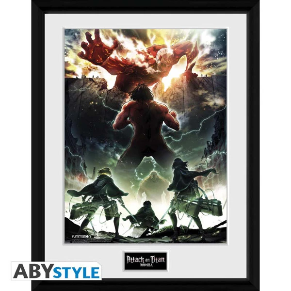 With the Survey Corps behind him, Eren Yeager takes on the dreaded Colossal and Armored Titans on this high-quality framed poster by ABYstyle. This stunning print memorializes the battle that raged after titans breached Wall Rose in the hit series Attack on Titan.