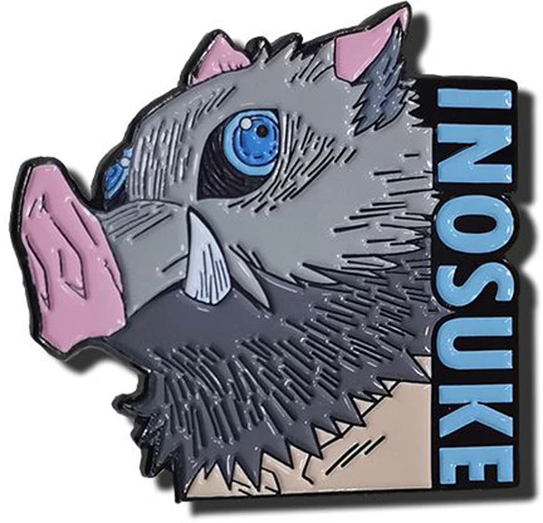 Inosuke is seen with a bare chest and wearing his boar head. His name is on the side of the pin in a shade of blue that matches the eyes of the boar.
