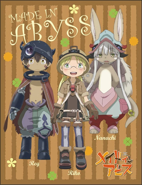 The main trio is seen in front of a bright wood-like background. Along with the swirly font and flower designs, you wouldn’t expect the terrors that await the three explorers in the Abyss. Still, Nanachi and Riko look enthusiastic for new experiences while Reg is just along for the ride. The journey may be scary, so you may want to wrap yourself up in this blanket for a sense of safety.